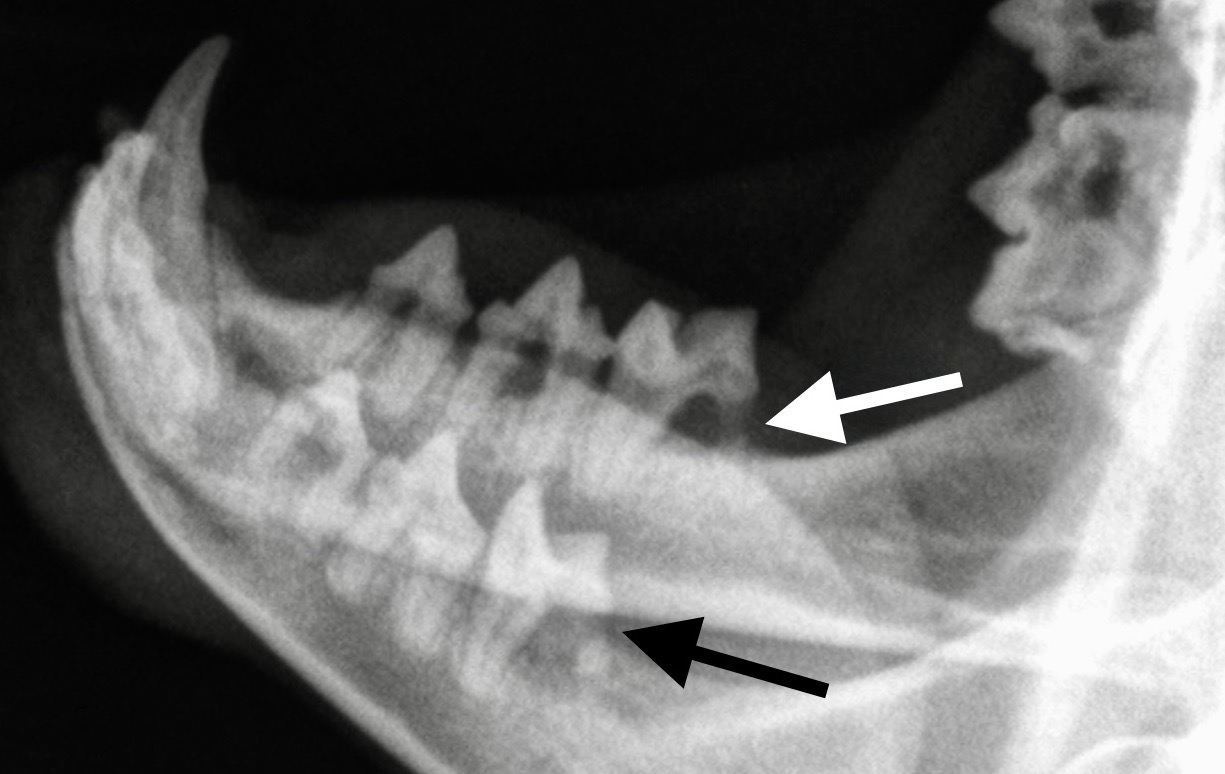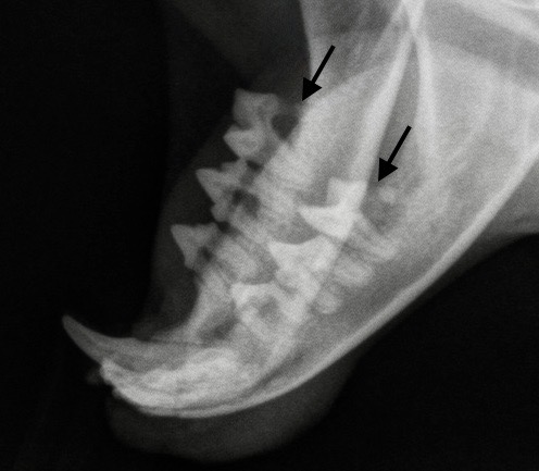 La photo de gauche montre des lésions de résorption du collet, sur une prémolaire et une molaire inférieures d’un chat en cours de détartrage : les flèches montrent la distance importante qui sépare la gencive (qui saigne au moindre contact), de la couronne de la dent : cette dernière est lysée, notamment sur la partie la plus caudale de la molaire. Photo de droite : et voilà ce que ça donne à la radio : la racine caudale des deux molaires inférieures a été rongée au point de quasiment disparaître (flèches).