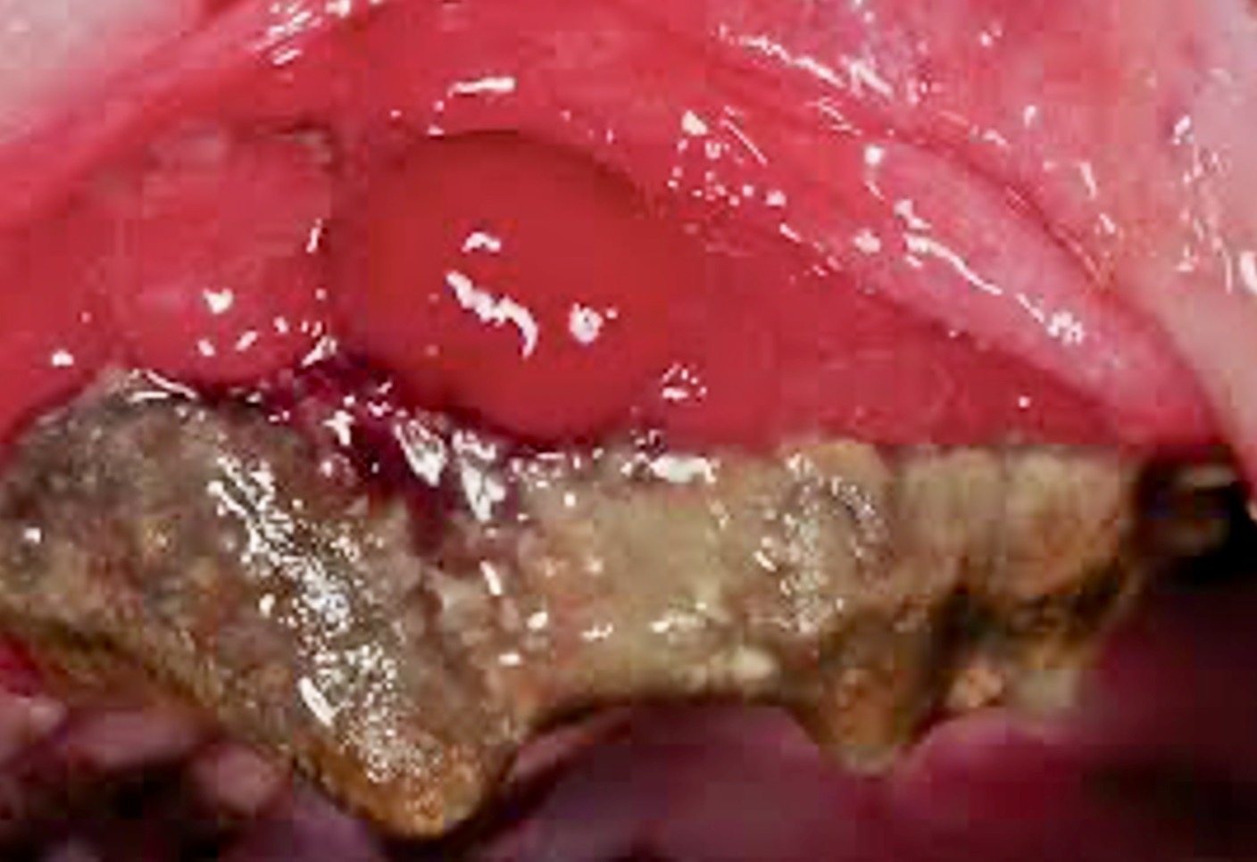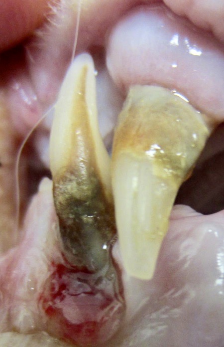 Photo ci-dessus : ce n’est quand même pas toujours aussi horrible, mais on peut en arriver là : une couche de tartre bien épaisse, du pus qui s’écoule en quantité, une affreuse inflammation de la gencive… le tout constituant bien sûr un superbe réservoir à bactéries !