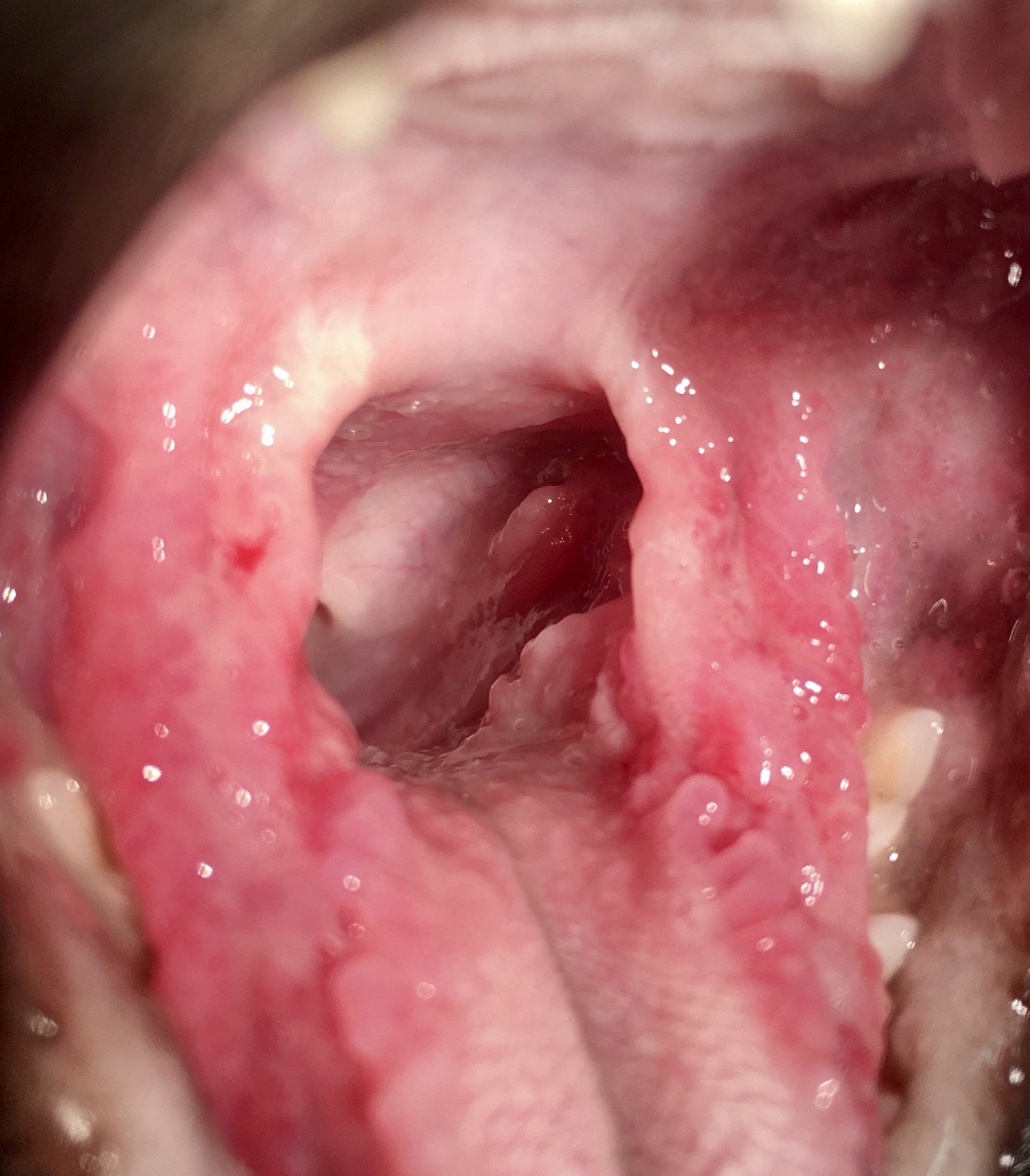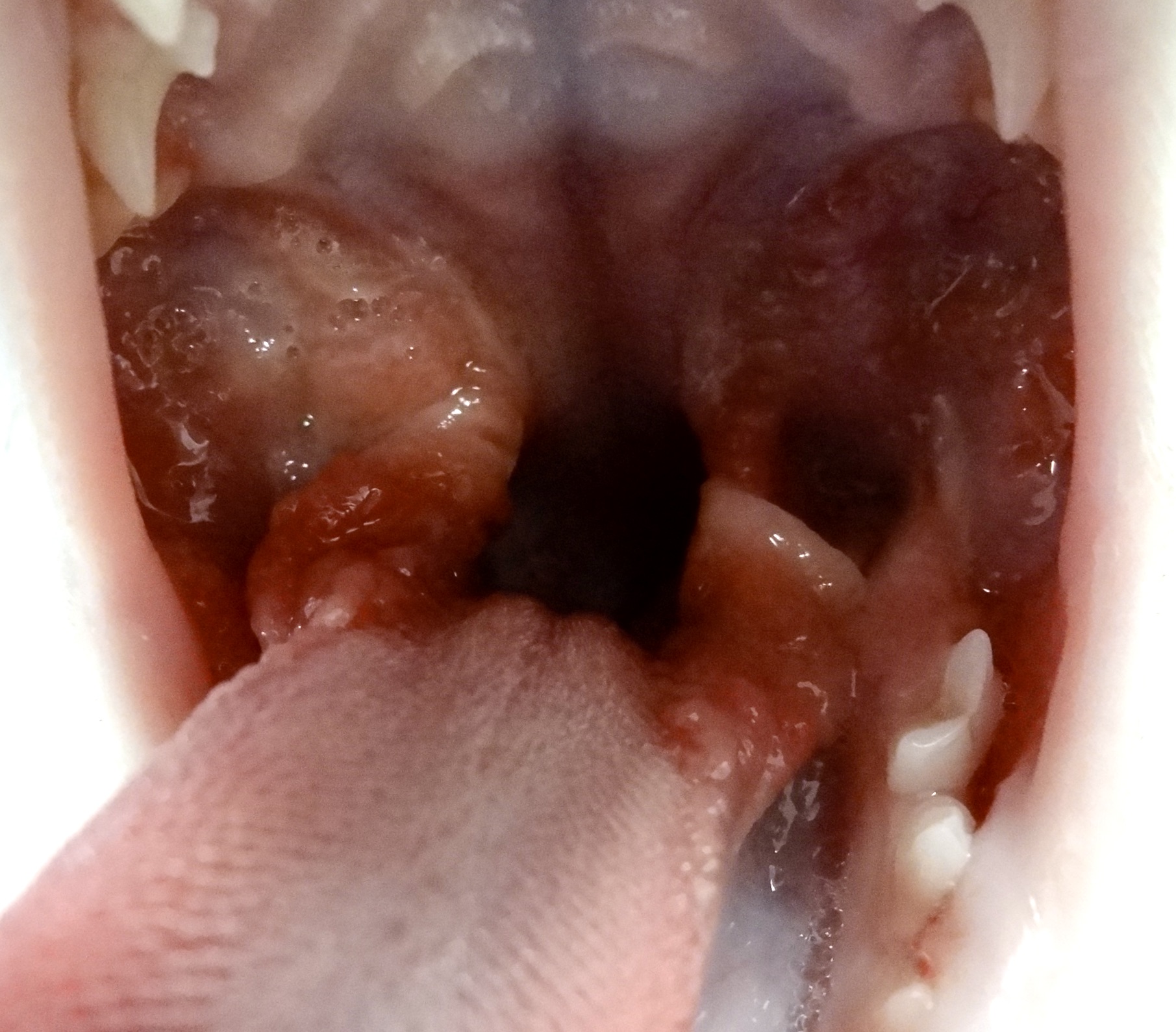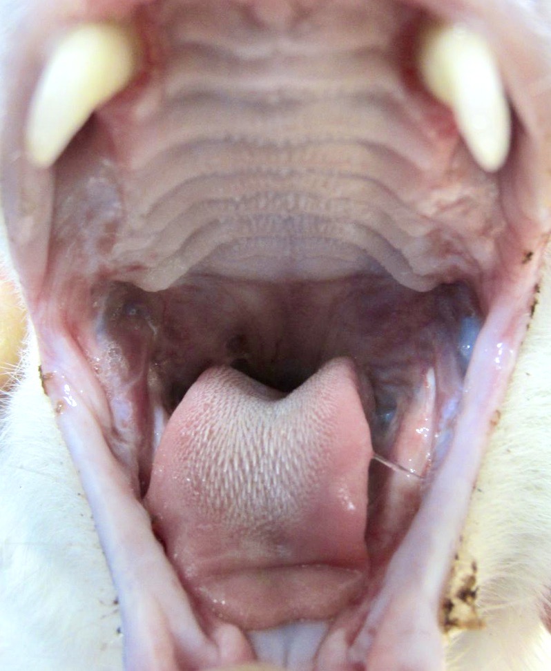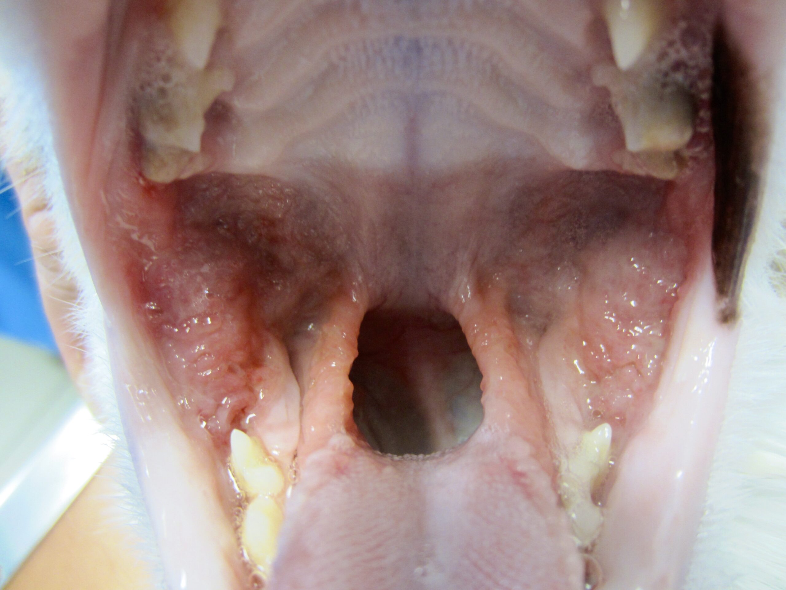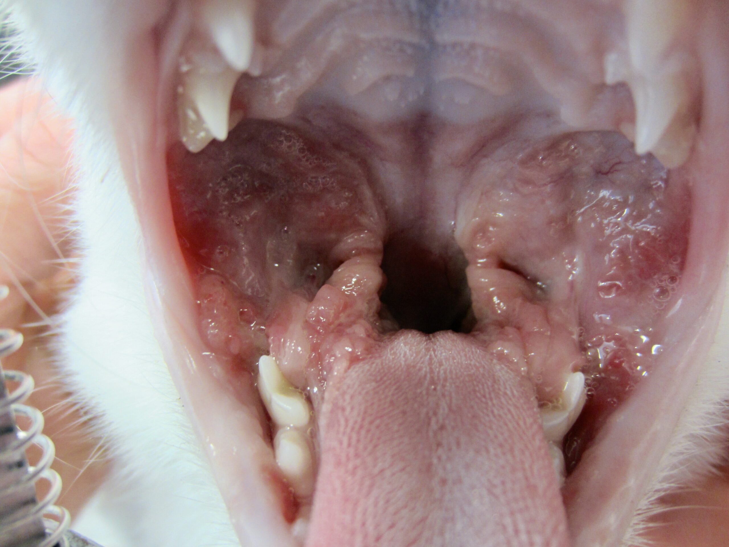 Ci-dessus : très forte inflammation des piliers du pharynx, avec une muqueuse rouge, horriblement bourgeonnante et ulcérée. Sur la photo de droite, l’inflammation touche particulièrement la langue. Dans les deux cas, les lésions sont bien symétriques… et on aura une pensée pour ces deux pauvres minous !