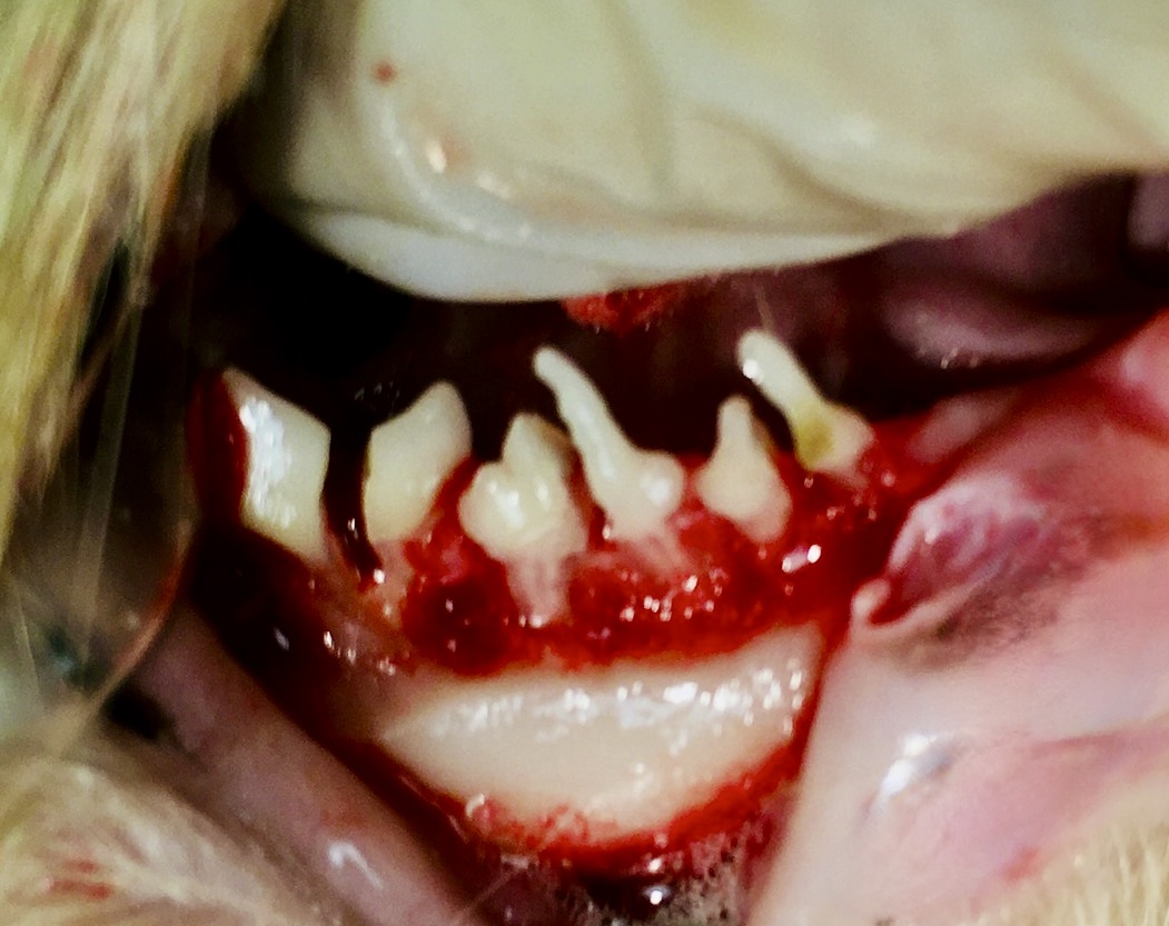 Le retrait des dents doit être particulièrement soigné : il ne s’agit pas d’y aller à la hussarde, en cassant la moitié des racines (déjà fragilisées par la maladie parodontale), dont on laisse des morceaux à l’intérieur, parce que là, tout ce qu’on aura fait n’aura servi à rien. L’extraction de l’ensemble des prémolaires et molaires est donc une intervention longue et minutieuse, qui doit être pratiquée par un praticien formé et disposant d’un matériel adapté, en l’occurrence une instrumentation manuelle, (syndesmotomes, daviers, élévateurs dentaires…), et rotative (fraises…). Inutile de préciser que la prise en charge de la douleur doit être une préoccupation constante avant, pendant et après ce type d’intervention !