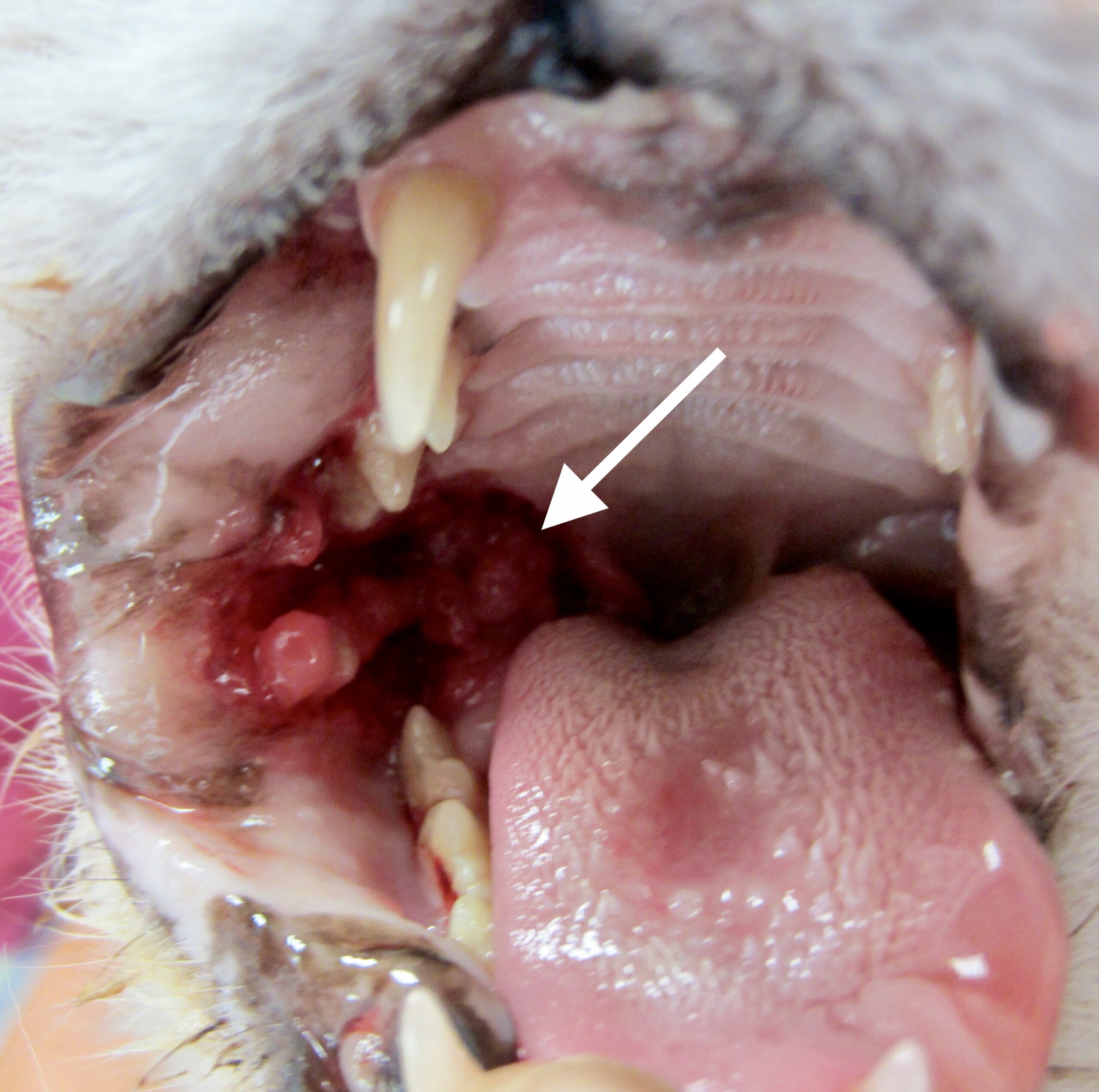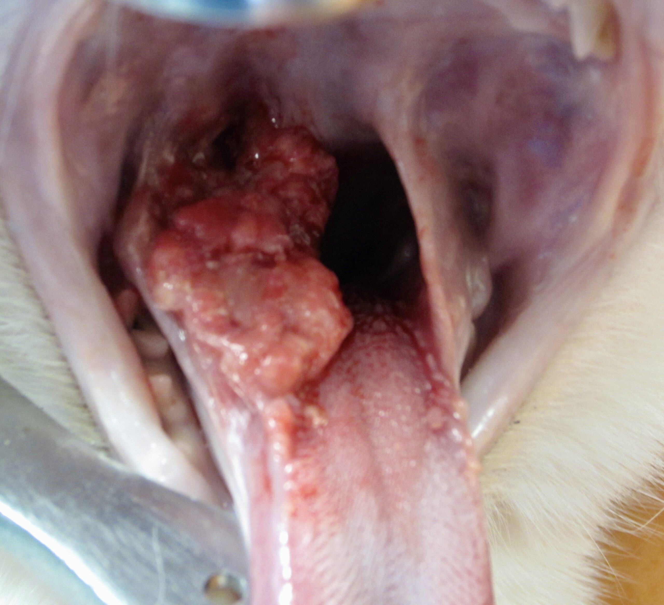 Il faudra quand même veiller à ne pas confondre une stomatite caudale avec d’autres affections provoquant des proliférations à l’intérieur de la bouche, notamment des tumeurs. On en montre quelques exemples ci-dessous, mais normalement, la distinction est assez facile à faire : la stomatite caudale, ça se passe tout au fond de la bouche, avec un grand placard rouge de chaque côté ; une tumeur, c’est une masse n’importe où dans la bouche, et d’un seul côté. Et si l’on a un doute, on peut toujours réaliser des cytoponctions ou des biopsies de la lésion.
