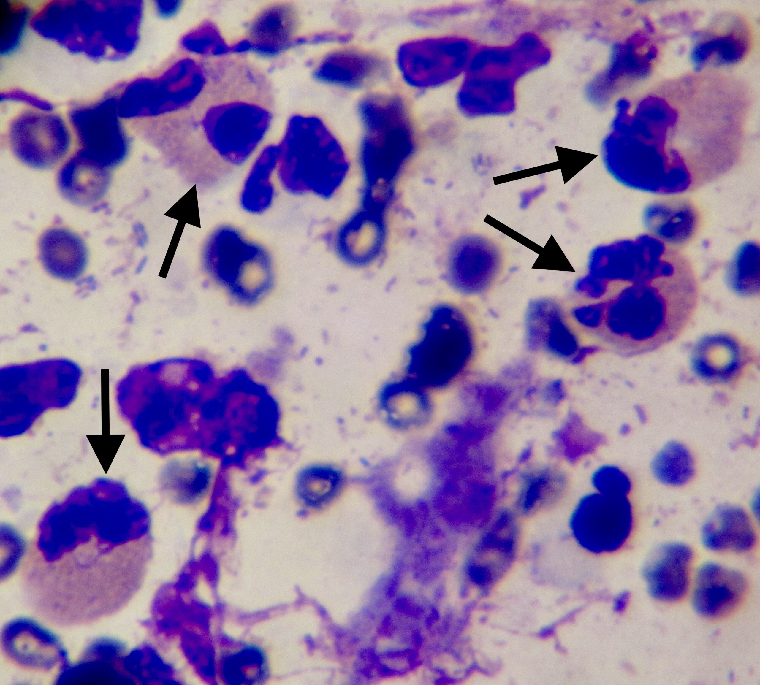 Un cas plus rare : cette lésion ne ressemble pas trop à une palatoglossite, (trop proliférante, présente d’un seul côté), mais sa texture, sa localisation sur l’un des piliers du pharynx… pourraient faire naître un léger doute. Doute levé par une simple cytoponction, montrant la présence de nombreux polynucléaires éosinophiles : il s’agissait d’un granulome éosinophilique dans une localisation inhabituelle, qui a bien répondu au traitement.