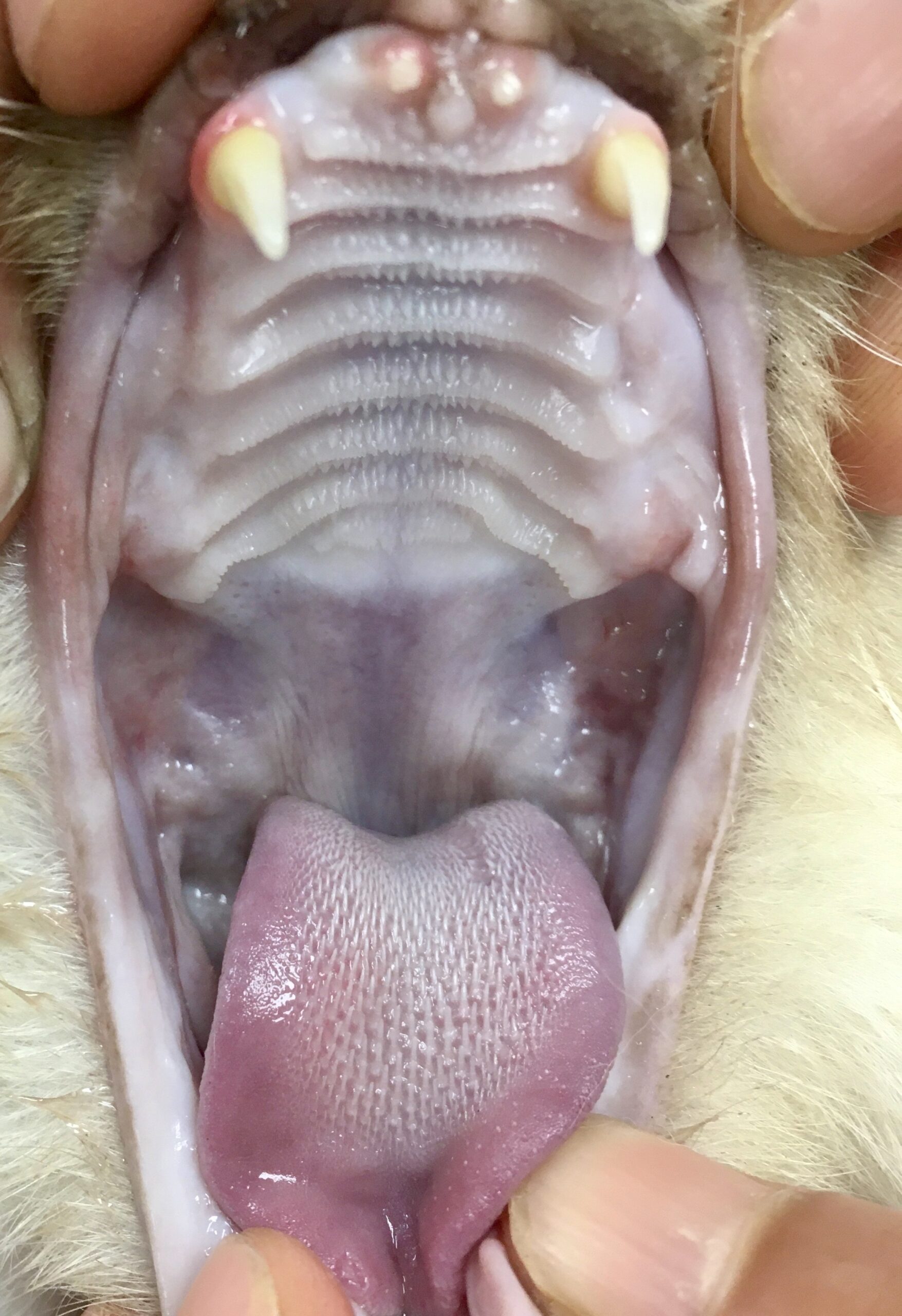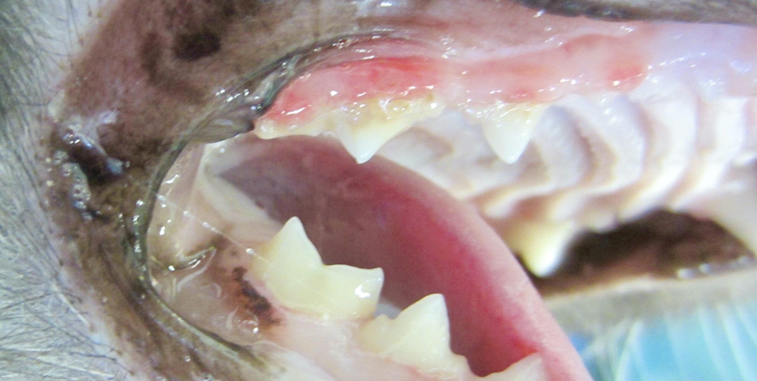 Bon, on a vu les photos (et allez, on en rajoute deux de plus) : le diagnostic de gingivite, de maladie parodontale et surtout de stomatite caudale (ou palato-glossite) ne pose pas trop de problème : il faut juste arriver à ouvrir la bouche du chat, qui ne se laissera pas forcément faire. Une sédation pourra donc s’avérer nécessaire… surtout que l’examen clinique aura aussi pour but de réaliser un état des lieux dent par dent en vue d’éventuelles extractions et que pour ça, il vaut mieux que Félix ne bouge pas trop ! On pourra aussi profiter de cet examen pour réaliser quelques prélèvements, dont on reparle un peu plus loin.