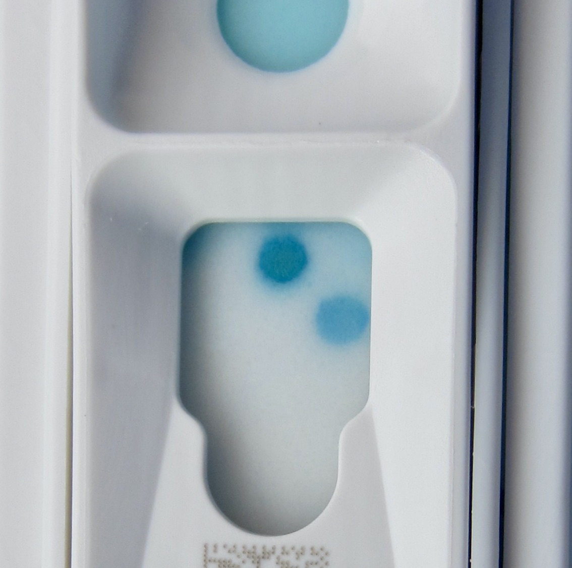 On en a parlé plus haut : un lien entre gingivo-stomatite et infection par les virus FIV ou FeLV n’est pas établi, mais comme l’affection est multifactorielle, et qu’avant de partir dans des soins importants, il est toujours bon d’avoir une vision complète de l’état du chat… il est classique de réaliser un test pour rechercher la présence éventuelle de ces deux virus. Celui-ci se pratique à la clinique, avec un résultat obtenu en quelques minutes. (Photo ci-contre : un test positif pour le FeLV).