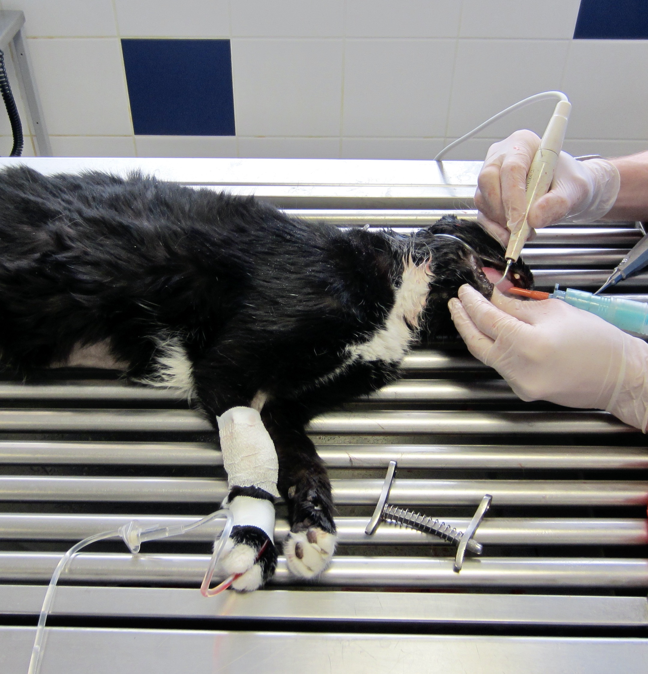 Détartrage chez un chat : le matou est sous perfusion, sur une table baignoire pour que l’eau qui coule de la bouche s’élimine en-dessous, et intubé avec une sonde trachéale. Le rôle de celle-ci est double : assurer le passage de l’anesthésique gazeux et, en obstruant l’entrée de la trachée, empêcher le passage vers les poumons d’eau ou de débris de tartre.