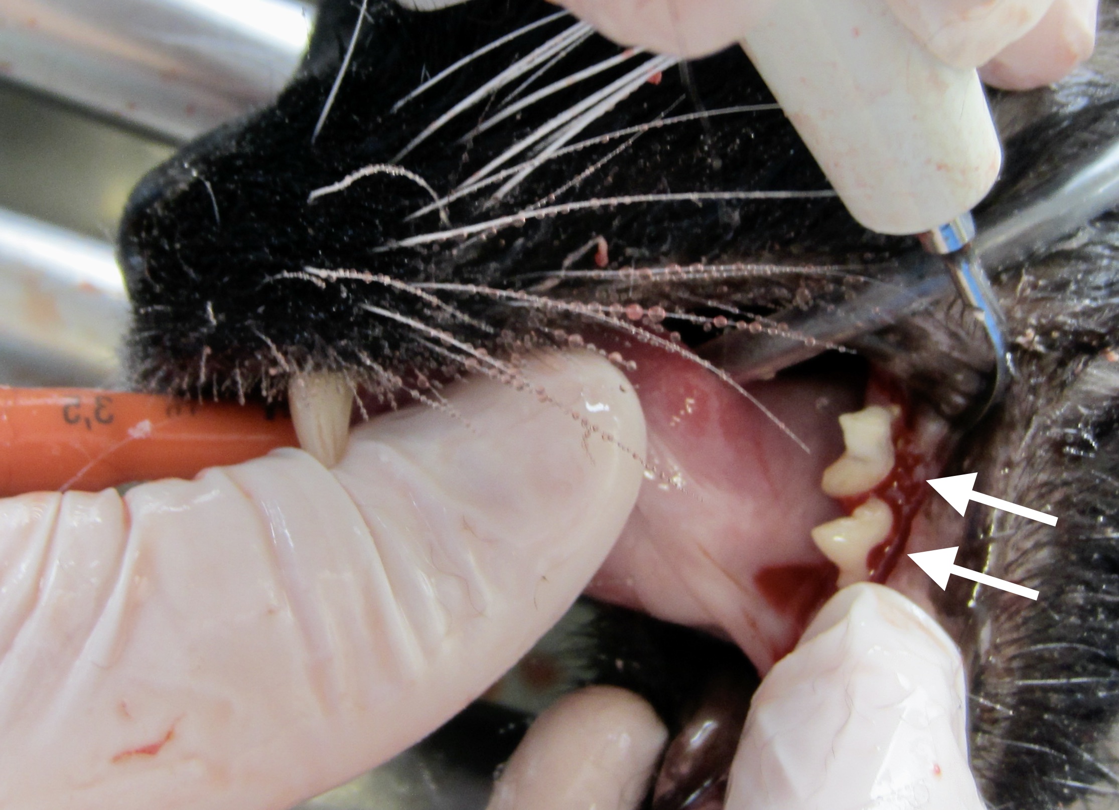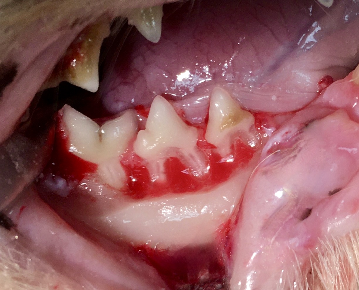 Alors, extractions, oui, mais qu’est-ce qu’on extrait ? Le plus souvent, toutes les prémolaires et molaires, plus rarement la totalité des dents. Après, toutes les options sont possibles, et ça se décide bien sûr au cas par cas. Une étude (Druet, 2017), n’a pas montré de différence significative en terme de résultat, entre les chats chez qui était pratiquée une extraction complète, (on enlève tout tout tout !), une extraction partielle ou sub-totale, (au moins toutes les prémolaires et molaires), et des extractions sélectives, à savoir uniquement les dents associées à une gencive ulcérée, une parodontite, présentant des signes de résorbtion, etc. Les dents conservées étaient évidemment rigoureusement traitées : détartrées (en supra et sous-gingival), et polies… Bon, classiquement, c’est quand même la deuxième option (extraction d’au moins toutes les prémolaires et molaires) qui est choisie (47/56 cas dans l’étude pré-citée), sachant qu’un chat se débrouille très bien sans dents, y compris pour manger les croquettes. (Soit il les avale tout rond, soit il les mâche avec ses gencives). Evidemment, pour attraper et mastiquer les souris, c’est moins pratique, surtout si l’on a enlevé aussi les crocs…
