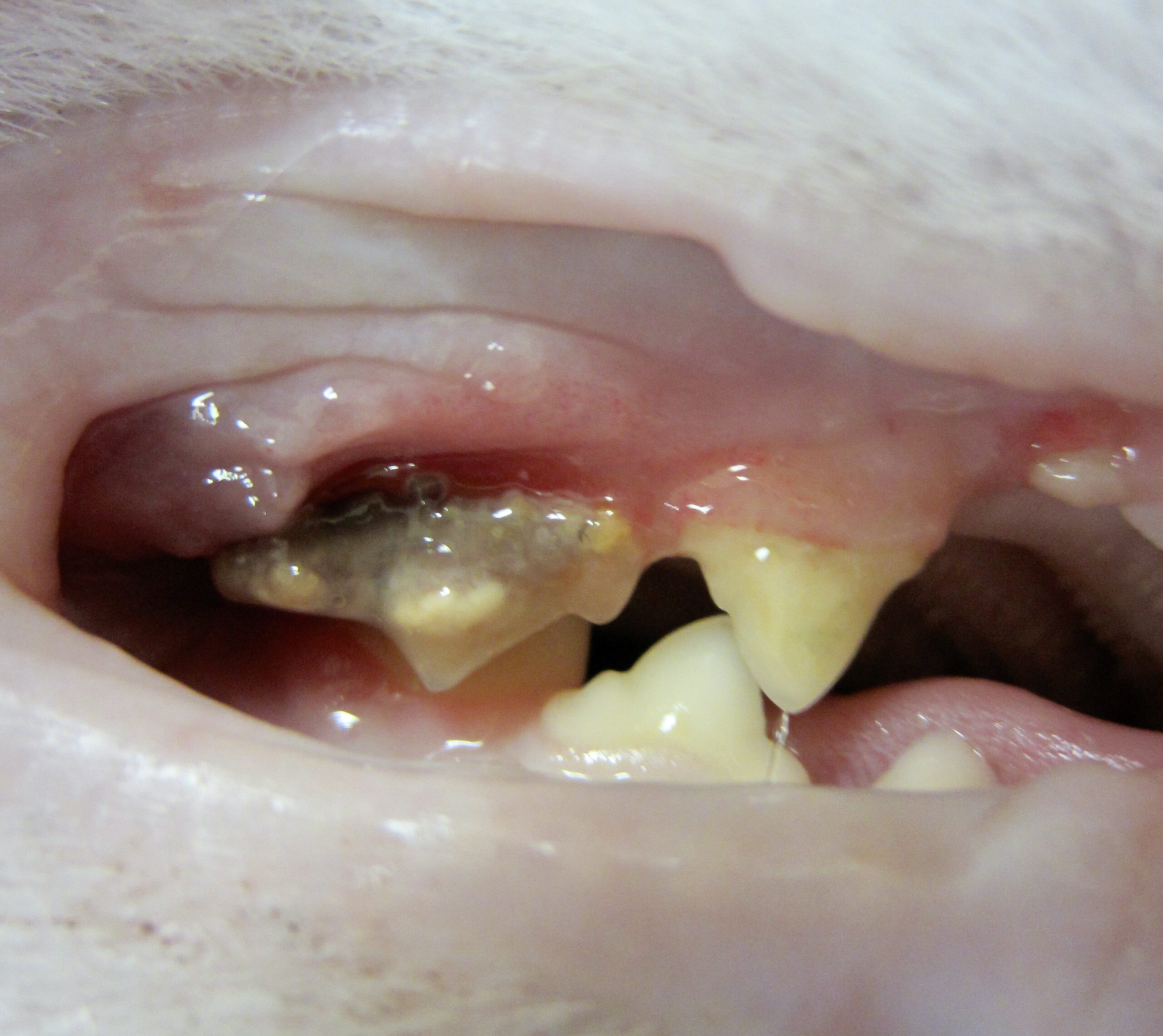 On va le voir juste après, la mesure la plus importante dans le traitement de la GSCF, ce sont les extractions dentaires – et souvent, ce sont presque toutes les dents que l’on retire. Et on a vu plus haut qu’un débris de racine qui traîne alors que le reste de la dent est parti, peut suffire à entretenir l’inflammation de la bouche. Il est donc intéressant de pratiquer des radiographies dentaires avant de s’attaquer aux extractions, afin de débusquer les racines enfouies qui pourraient passer inaperçues après un simple examen externe. (Photo ci-contre : la racine postérieure de ces deux molaires ne va pas tarder à casser, avec le risque que l’extrémité arrive à se faire oublier, bien cachée au fond de son alvéole !)